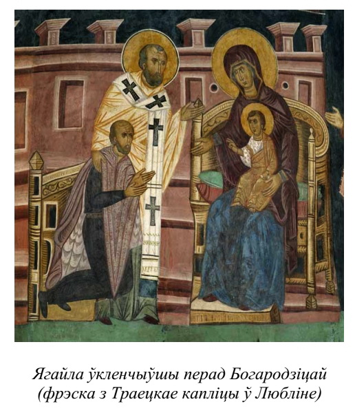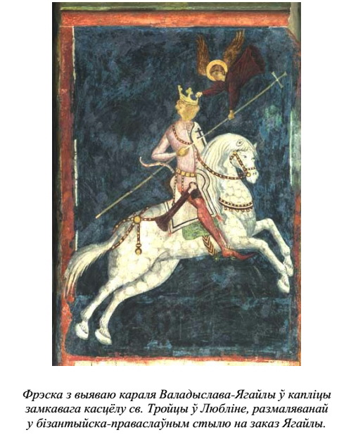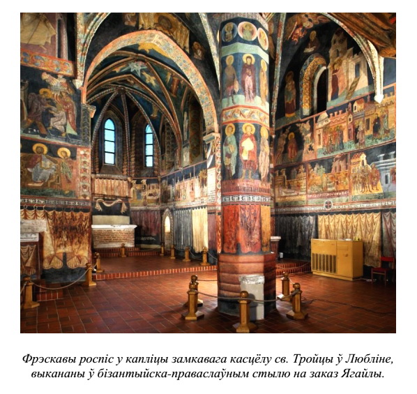 "Замілаванне ўсходнім малярствам Ягайла выявіў амаль ад сама пачатку свайго каралявання ў Польшчы, даручыўшы ў 1392-1394 гг. усходнім майстром работы ў бажніцы на Лысай гары і ў сваёй лажніцы. Потым ён заказаў роспісы ў Марыінскай капліцы і ў капліцы Святой Тройцы ў катэдры на Вавелю, у калегіятах у Судаміру і Вісліцы і ў катэдры ў Гнезне. Крыніцы таго часу не падаюць больш падрабязных звестак аб паходжанні майстроў, якіх мянуюць агулам як pictores Ruthenicos ("рускія мастакі"). <... > За пазнейшых часоў Длугаш азначае малярства ўсходніх майстроў як sculptura або pictura graeca, graeco opere, што сведчыць адно аб яго бізантыйскай, а не каталіцкай прыналежнасці" [65]. Я. Длугаш таксама адзначаў: "...Ягайла ад маленства меў грэцкае рэлігійнае выхаванне і густы ды заўжды захоўваў любасць да ўсяго, што патыхала грэчызнаю" [66].