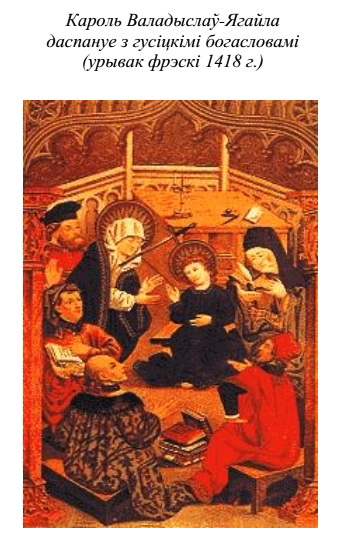 "Гаспадарствавая мова і мова літаратуры, дойлідства і малярства ў Літоўскім гаспадарстве - усё гэта для самой Польшчы на момант Крэўскае уніі, дый пасля яе, беспярэчна ўспрымалася як рускае. Выхаванне вялікіх князёў літоўскіх (у тым ліку і Ягайлы), знітаваных дынастычна з рускімі княствамі, мела той самы характар. Дыкжэ не выпадкова пры двару першага польскага караля з літоўскае дынастыі Ягайлавічаў -Валадыслава-Ягайлы - панавала беларуская культура, якая ў такім раннім часе свайго ўспраўлення, як мы ўжо казалі, у аснове сваёй была старажытнаруская. Як паказуюць каралеўскія лічбавыя кнігі, не адно лоўчыя, але і лютністыя, цымбалістыя, мастакі пры польскім каралеўскім двару былі "русіны". <... > Адзін за адным паўстаюць на землях Польшчы "рускія" роспісы. Важна падчыркнуць, што яны аздаблялі не адно нутраныя каралеўскія пакоі, як гэта было ў Вавелю, а пашыраліся па цэлай Польшчы. "Рускія майстры" размалявалі сцены катэдры ў старажытнай сталіцы Польшчы Гнезне, у шырока вядомым праз сваю рэліквію Крыжа кляштару на Лысай Гары, у калегіятах найстаражытнейшых гарадоў і асяродкаў Польшчы - Вісліцы (1413-1416 гг.), Судаміру (1430-я гады) і ў касцёле св. Тройцы ў Любліне (1418 г.)" [64].