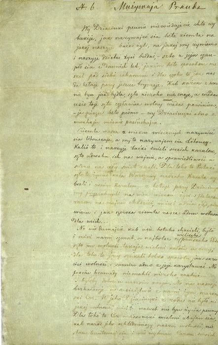 Зямля наша з вякоў вечных называецца літоўская, а мы то называемся Літоўцы. Калісь то і нашыя бацькі імелі сваіх казалак, што адвагу іх на вайне, а справядлівасць у судзе на цэлы свет зналі. Дла таго то Палякі, што то жывуць каля Варшавы нашага Караля выбралі і сваім Каралём, з гэтае пары, Дзецюкі, мы прысягнулі на век вякоў жыці з Палякамі, разам на вайну хадзіці, меці адзін ронд, адну вечу і як шэрока зямля наша адну вольну для ўсіх.