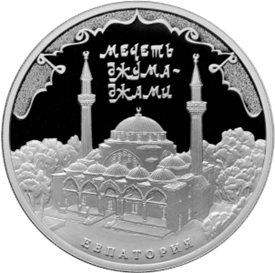 На реверсе изображена мечеть Джума-Джами. Вверху ее название. Внизу есть надпись с названием города - Евпатория. Именно здесь расположена мечеть.