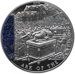 На аверсе изображена картина французского художника Ж. Фуке - Иерихонские трубы. В левой части монеты вставка лазурита. В нижней правой части надпись на английском, в переводе означающая Ковчег Завета.