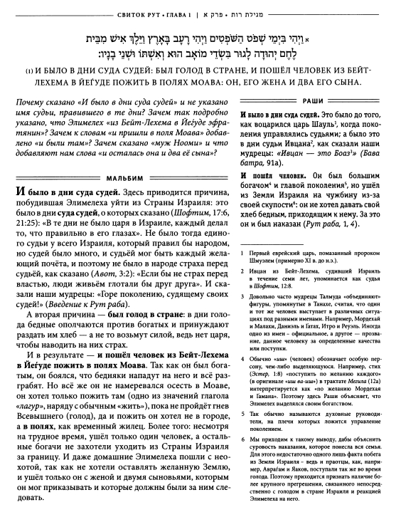 Это две стороны истины, которые указывают нам на различные аспекты темы или стиха (Михтав ме-Элиягу, 4.1,с.353 и ч. 2, с. 173). При подготовке проекта мы руководствовались классической формой и основными компонентами комментированного издания Танаха «Микраот гдолот», впервые вышедшего в свет в 1517 году и с тех пор переиздававшегося сотни раз. Однако, воспользовавшись формой, мы расширили содержание, включив в наше издание достижения еврейской мысли последних двух тысячелетий. Данный труд - это не только очередной перевод классического текста, но и принципиально новый, еще не знакомый русскоязычному читателю способ подборки и подачи материала комментариев. Такая форма позволит каждому читателю воспринимать тексты Свитка Рут на различных уровнях: от простого прочтения до глубокого изучения каждого стиха и попытки постижения глубинного смысла, заключенного в Святых книгах Танаха.